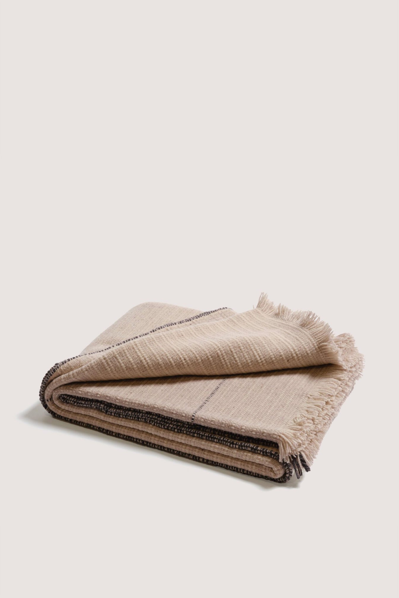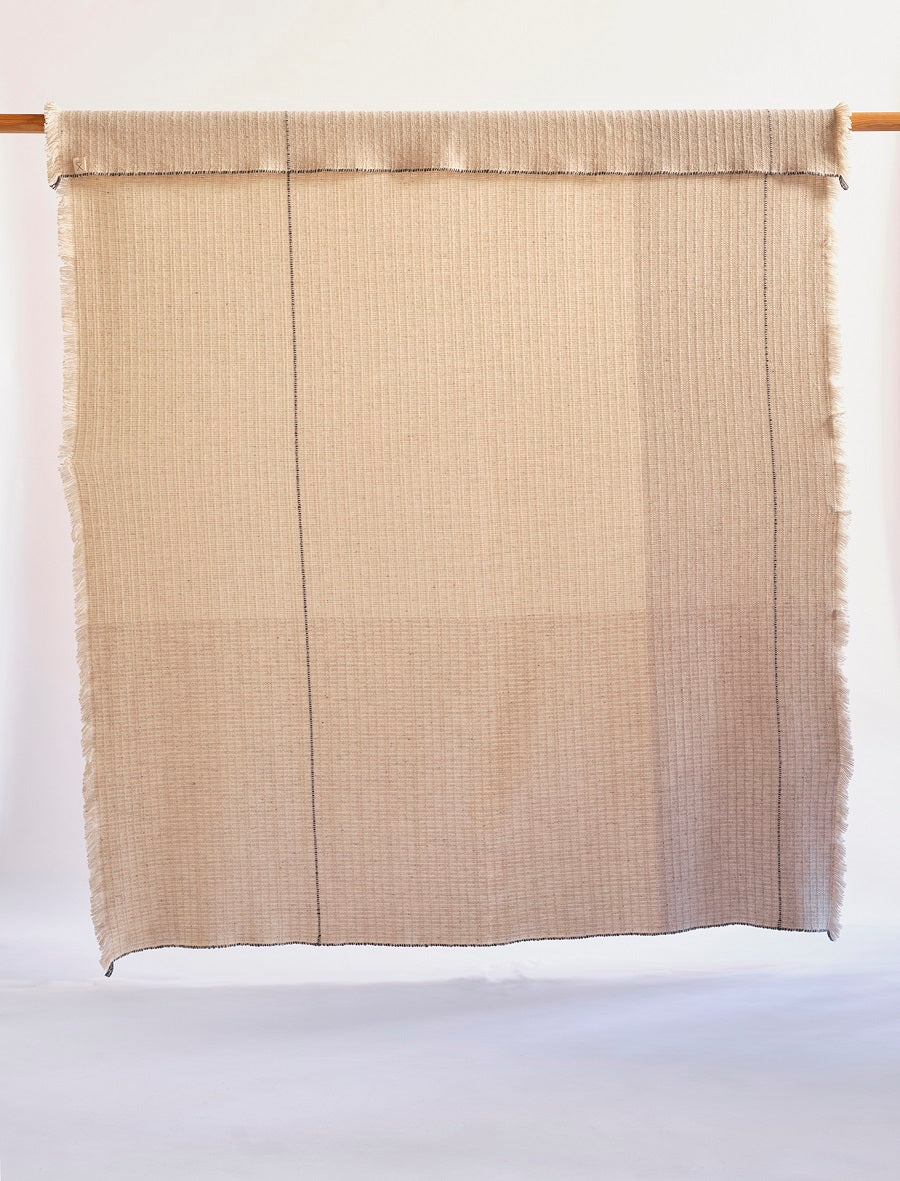 Una manta de cama lisa y de textura suave y de diseño uniforme. Lana Merino 100% ecológica, reversible y trazable en los tonos crudos y grises del hilo natural de la lana. Cuatro parches de colores y texturas mixtas dan vida a esta manta que funciona mejor en espacios neutros. Con ribete gris antracita en la parte inferior de la manta y flecos alrededor de los bordes.