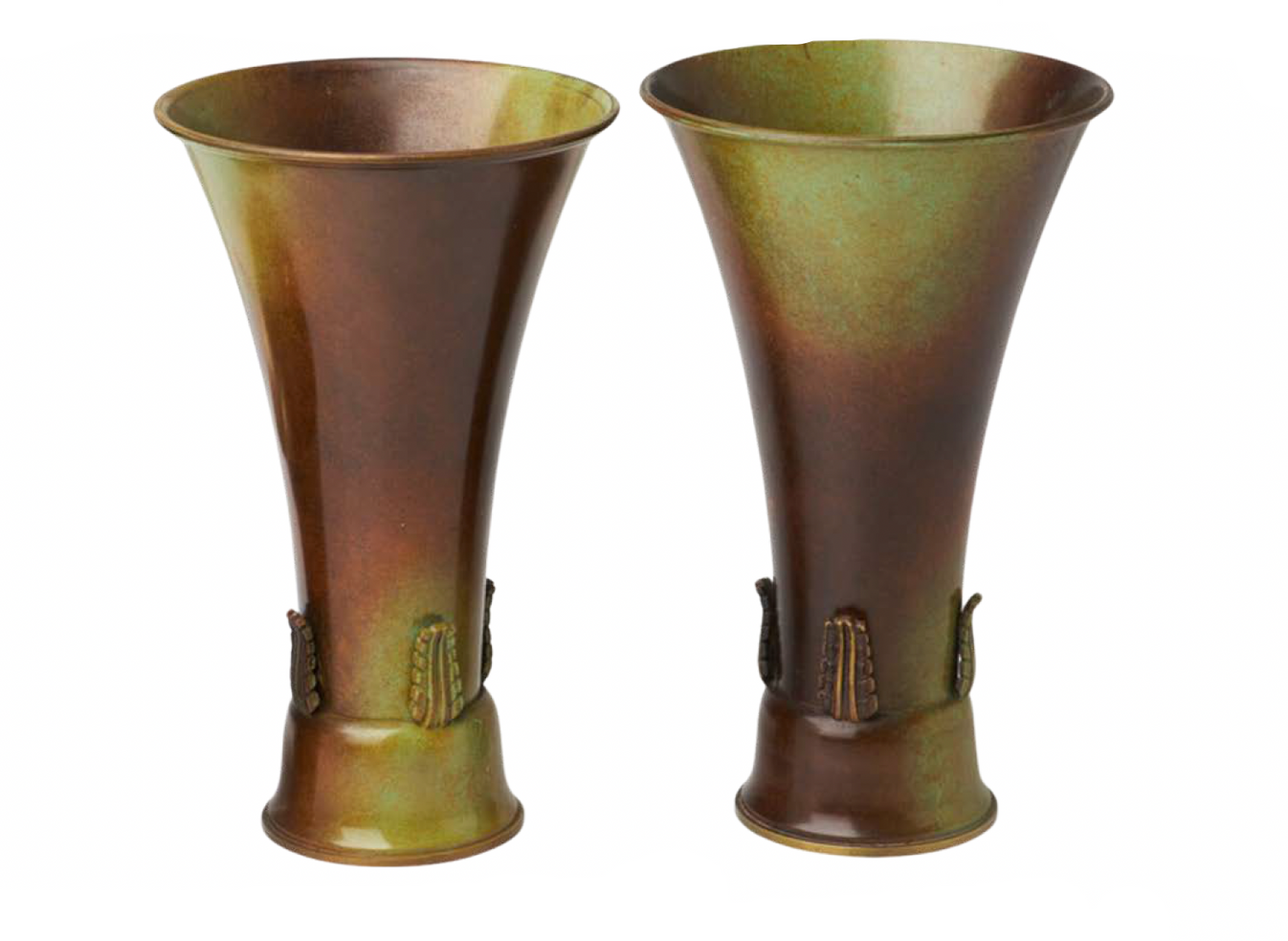 1930's Sweden. Pair of Bronze "Kunga-Vasen" (King Vase) by Ystad Metall. TheKungavasen model was designed in 1930's and received its name when the Kingof Sweden, Gustav V purchased this model vase for himself. Vase has a taperedform with Swedish Grace style leaves adorning the base Stamped by maker onunderside.