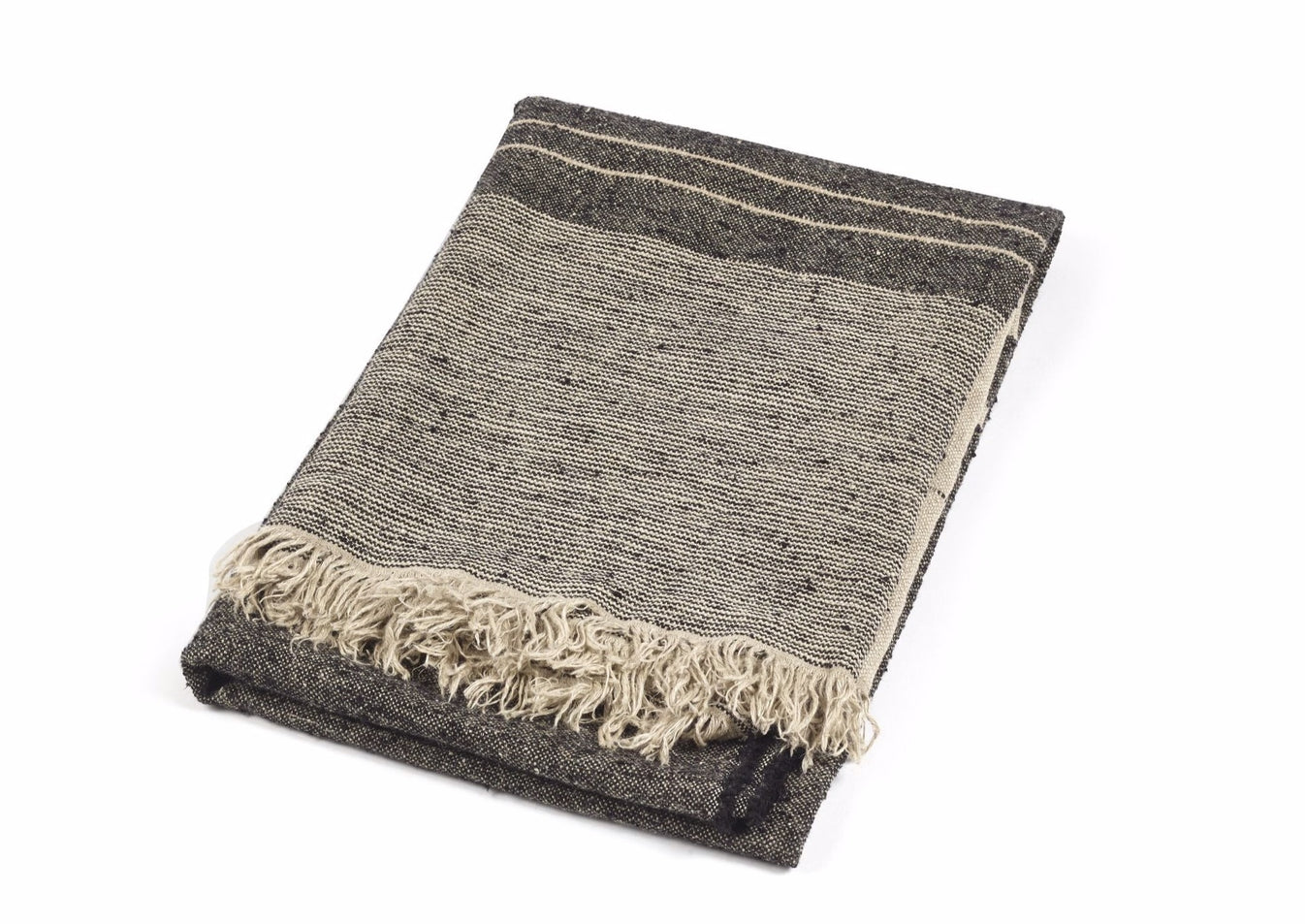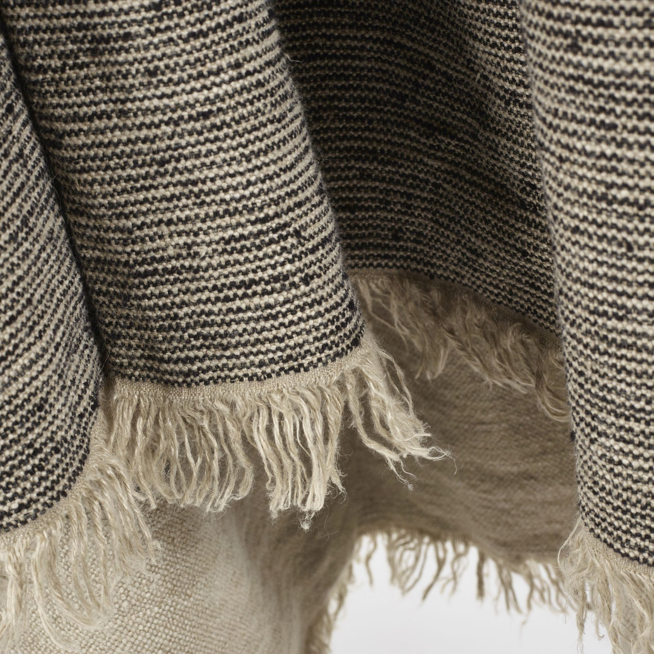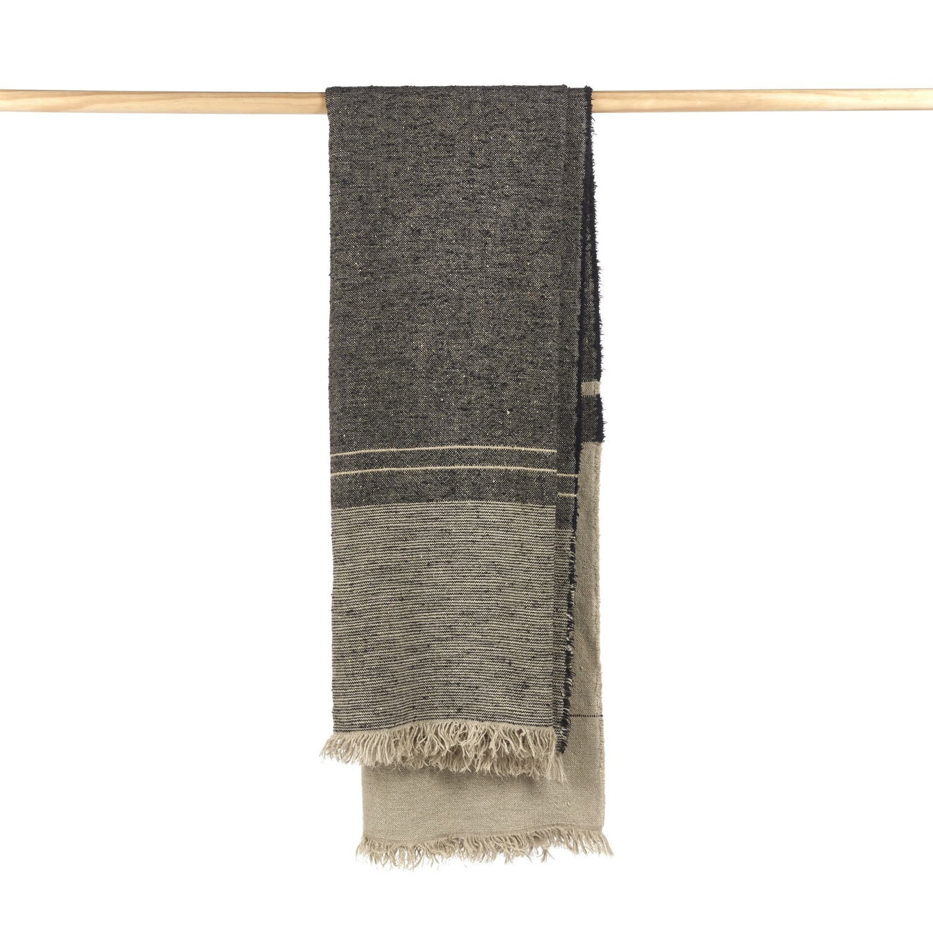 La manta Francis está hecha de un tejido suave y lujoso. Su diseño contiene algunas rayas, hilos y construcciones diferentes, pero es la combinación de lino natural y tonos negros lo que llama la atención.