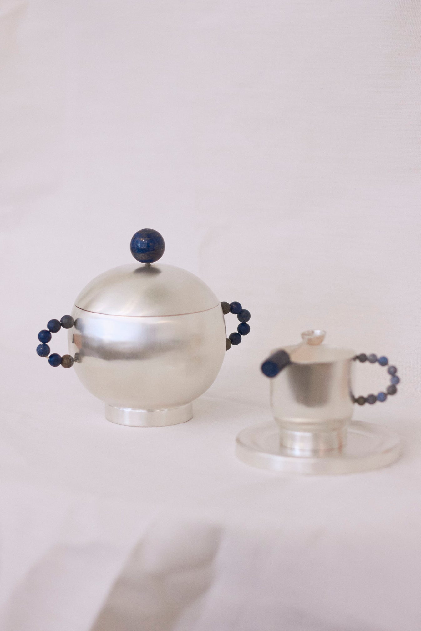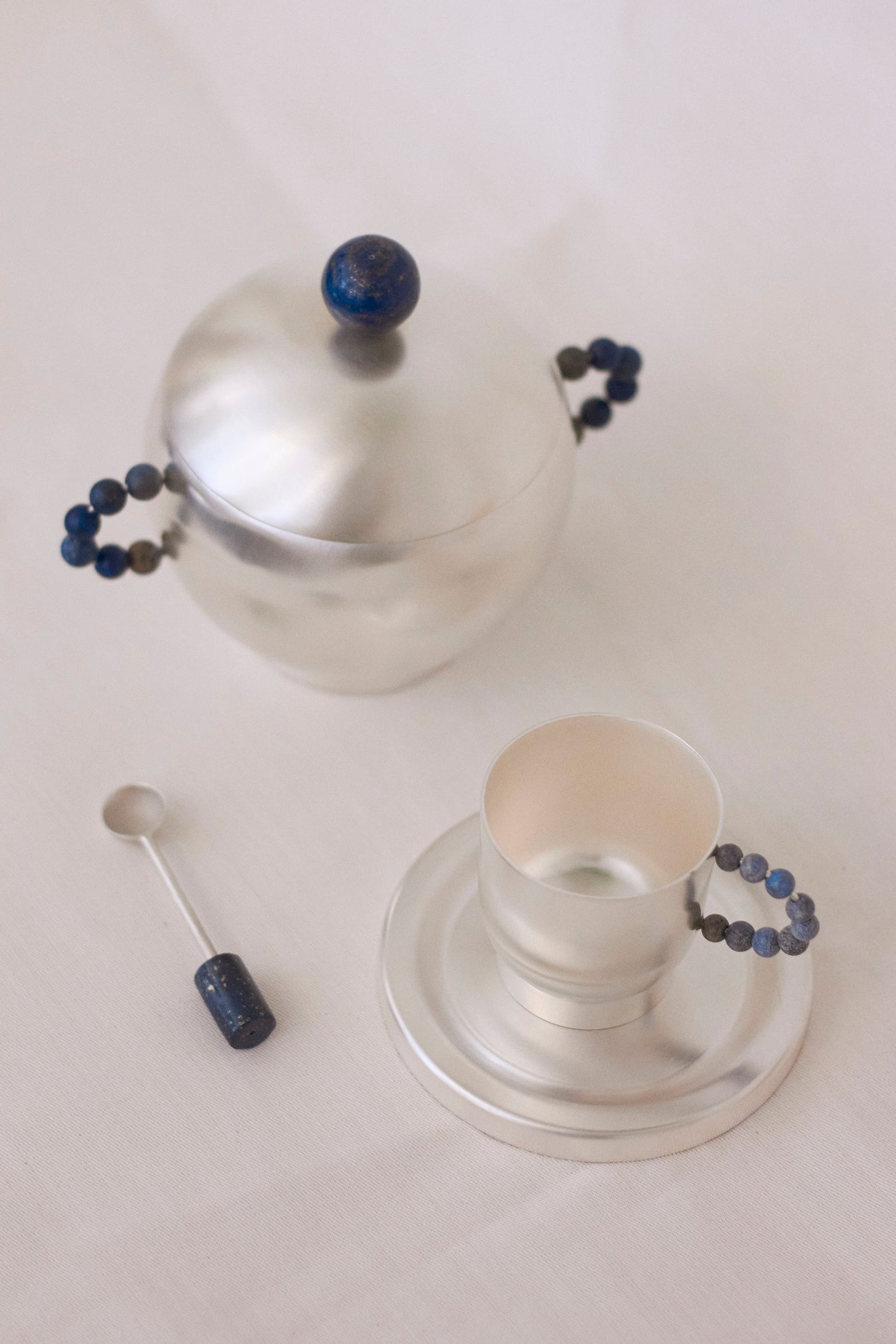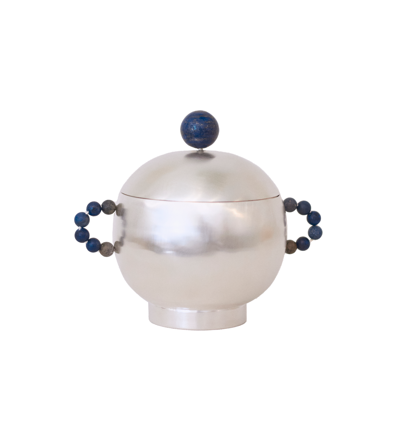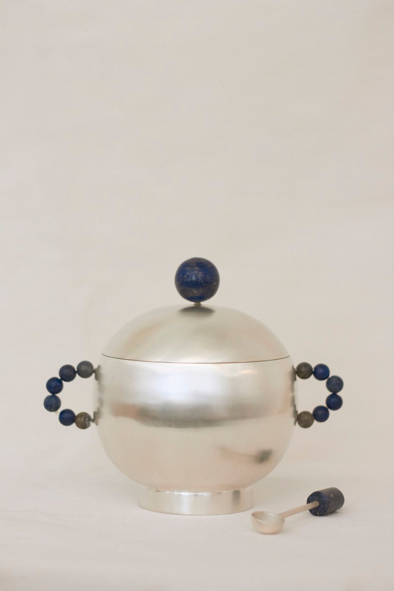 Elevate your dining experience with the sugar perlina, a plated brass container expertly crafted in italy using sheet turning techniques. The curved handles and top are adorned with lapis lazuli stones, adding a touch of jewelry inspired sophistication to your tablescape.
