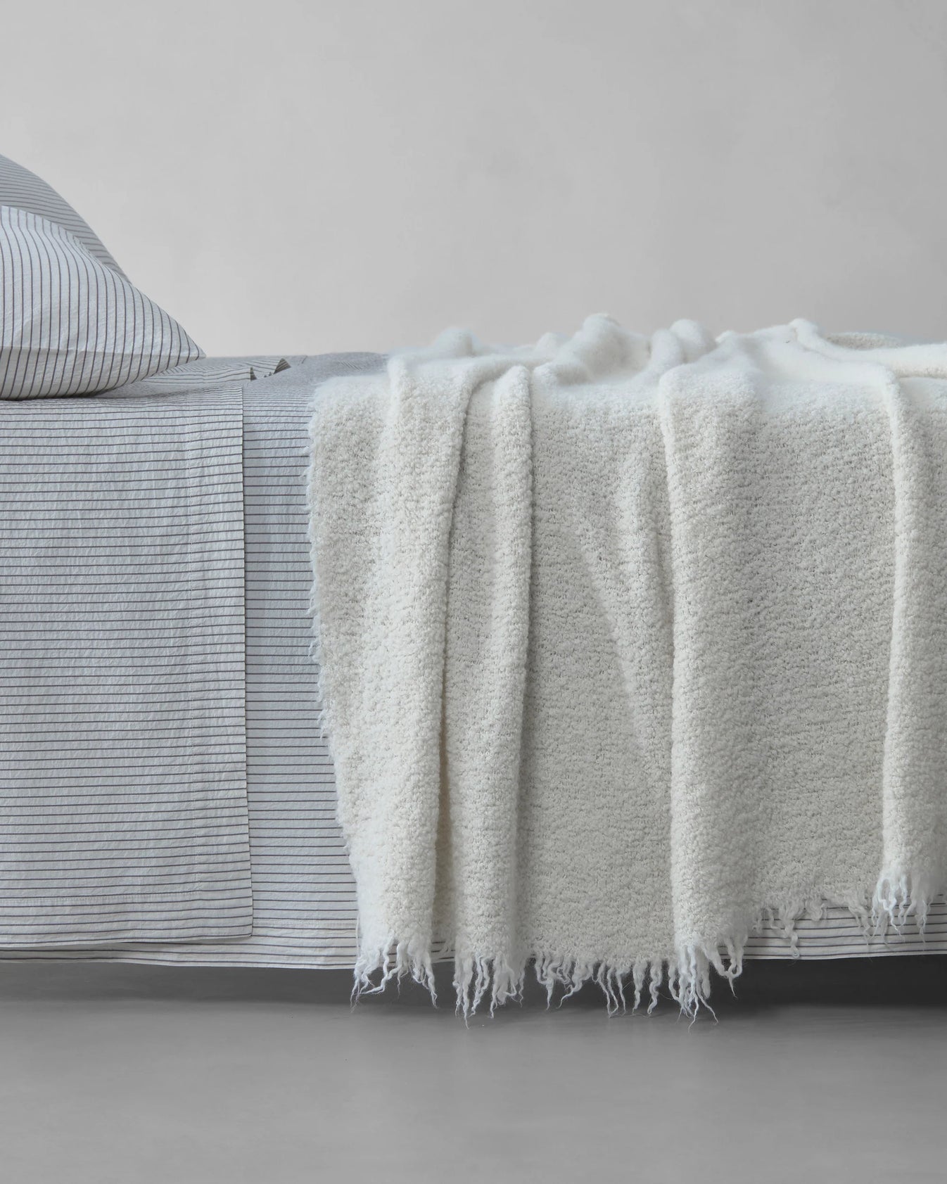 MULTI, one of the most iconic throws by Society, is revisited into a bigger, monochromatic version: this is TUIS, a warm blanket in bouclé alpaca wool with frayed edges and a soft, cosy look. The blanket is big enough to fully cover the bed and with its finishing it is perfect for the coolest months.